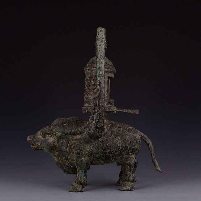 湖南省博物館的西漢牛形燈,燈為牛形,兩角沿背的兩側(cè)以圓管狀向上豎立,并會合為一,向下擴大為覆碗狀,作為出煙管。牛腹中空可盛水,點燃時煙可通過腹中,以保持室內(nèi)空氣清潔,側(cè)有銘文十字,為當時長沙王劉發(fā)或其后代宗廟用器。